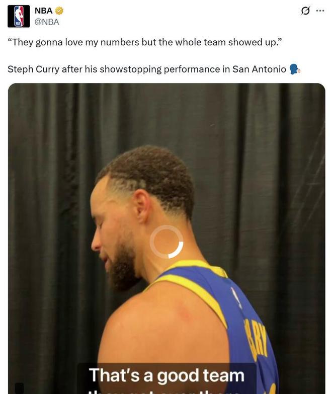 3个小细节也值得关注 在库里打出现象级表现的夜晚,勇士队这三个小细节也同样值得关注。 细节一:库里称赞全队 赛后交出现象级表现的库里几乎将全队球员点名夸了个遍,库里说道:“对手很出色,想尽一切办法要拿下胜利,但你就是要在这种磨砺中找到办法,外界可以更喜欢我的数据,但我想说的是本场比赛我们全部球员都站了出来,波杰、追梦、小佩顿、穆迪、霍福德、巴特勒等等,大家都站了出来,我太爱这种画面了。”