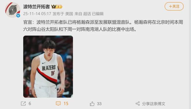 11月14日,@波特兰开拓者队发文:“官宣:波特兰开拓者队已将杨瀚森派至发展联盟混音队。杨瀚森将在北京时间本周六对阵山谷太阳队和下周一对阵南湾湖人队的比赛中出场。 ”
