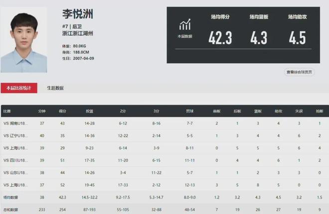 6场比赛,李悦洲场均轰下了42.3分4.5助攻,每场比赛顶着双人甚至三人包夹,投出了场均35.6%的三分球命中率。 淘汰赛阶段的比赛是背靠背靠背,连打三场,李悦洲先是在四川U18男篮身上拿下51分4篮板6助攻,半决赛对阵山东U18男篮又轰44分,最后面对上海U18男篮的上半场就独得接近40分,全场拿下52分。