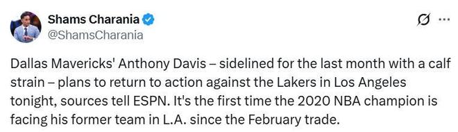 自今年2月那笔重磅交易以来,这将是浓眉首次在洛杉矶对阵自己的老东家湖人队。浓眉曾于上赛季在达拉斯与湖人有过一次交锋,那场比赛,独行侠主场97-112不敌湖人,浓眉出战33分22秒,13中5,得到13分11篮板6助攻。 浓眉自10月30日起便一直缺阵,最初他将复出日期定在11月9日客场对阵华盛顿奇才队的比赛。然而,独行侠队老板杜蒙特搁置了这一计划——他听从了达拉斯队健康与表现主管比尔兹伯勒的建议,坚持认为除非有医疗数据表明浓眉不存在小腿拉伤加重的风险,否则不会批准其参赛。在周四的训练结束后,浓眉向记者表示,他将在独行侠队周末背靠背对阵两支洛杉矶球队(湖人与快船)的其中一场比赛中登场。 “你知道我想打哪场比赛,”他说道,言语中暗指与老东家(湖人)的这场对决,“但具体情况还要看后续安排。” 目前的计划是,浓眉将缺席明日对阵快船队的比赛,同时会出战周二客场对阵掘金队的比赛。 浓眉此次复出,距离独行侠队解雇总经理哈里森已有17天;与此同时,外界普遍预计独行侠队将在2月初的交易截止日之前,为浓眉探索交易市场。 “这(交易传闻)不会影响我,我已经被卷入交易讨论有一段时间了,”浓眉表示,“我的职责就是在球场上做好自己该做的事——打好篮球,并努力带领这支球队。无论最终结果如何,都顺其自然。对于这些事情,我其实并没有太多控制权,但我与球队管理层保持着畅通的沟通渠道,现在我只准备好重返赛场了。” 美记Brett Siegel撰文谈到了浓眉的交易流言。他表示,关于浓眉可能转会的消息尚未有任何进展。NBA各队普遍认为,他很难恢复到在湖人时期的状态,他在独行侠的最新伤情也引起了外界的担忧。
