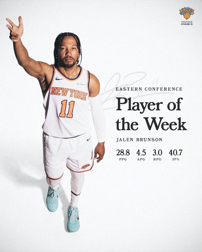 对快船一战,东契奇43分9篮板13助攻1抢断1盖帽;对独行侠一战,东契奇35分5篮板11助攻;对鹈鹕一战,东契奇34分12篮板7助攻。 赛季至今,东契奇场均35.1分8.7篮板9.2助攻,湖人15胜4负,暂列西部第二。 东部周最佳:布伦森(尼克斯) 过去一周,布伦森场均28.8分4.5助攻,三分命中率40.7%,率领尼克斯取得4胜0负的佳绩。