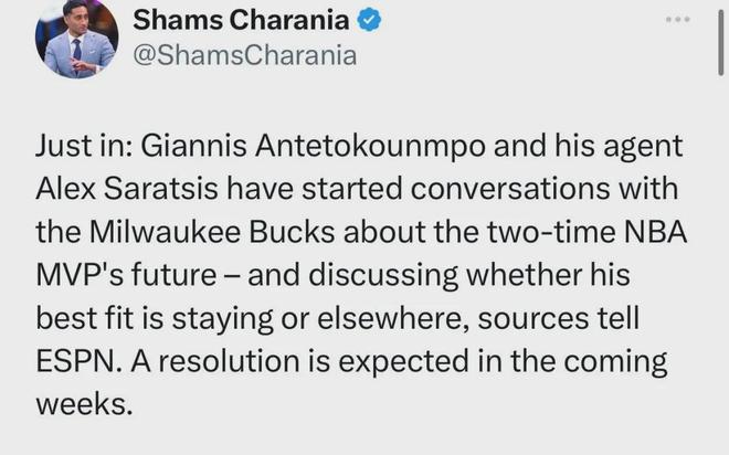 同样来自爆料王Shams的消息源,倘若字母哥申请交易,涉及的球队将远不止纽约尼克斯。薪资专家Marks对此表示,其余29支球队都会跟雄鹿打电话询价字母哥。