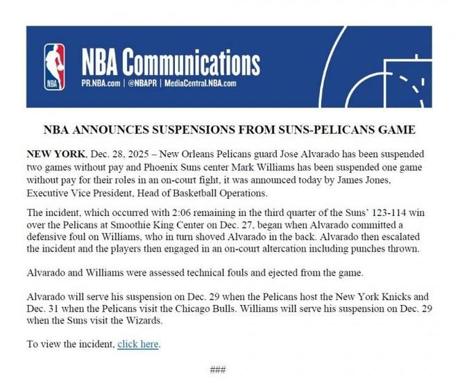 NBA官宣太阳鹈鹕冲突罚单:阿尔瓦拉多禁赛2场马威禁赛1场