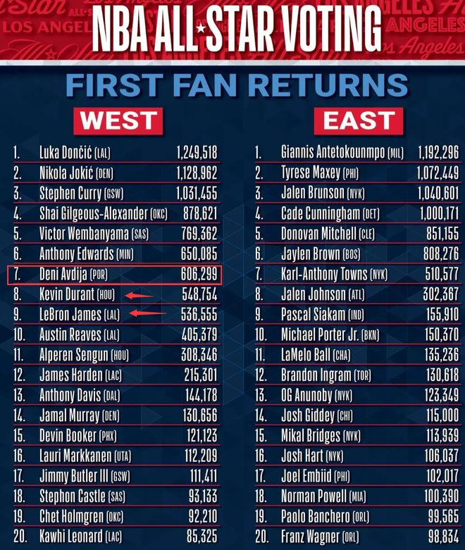 在首次公开全明星投票中,阿夫迪亚606299票,超过了杜兰特548754票、詹姆斯536555票,阿夫迪亚排在第七的位置。