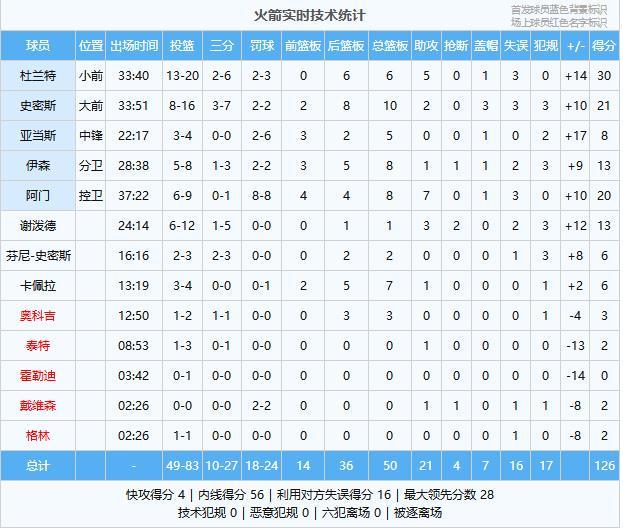 比赛数据:步行者:西亚卡姆23分4板4助、马瑟林14分3板4助、内史密斯14分3板3助、沃克12分2板3助、内姆哈德11分1板2助3断、弗菲9分4板1助、赫夫8分4板1助、杰克逊7分2断、麦康纳6分1板4助 火箭:杜兰特30分6板5助、史密斯21分10板2助3帽、阿门20分8板7助、伊森13分8板1助、谢泼德13分1板3助2断、亚当斯8分5板、卡佩拉6分7板1助、芬尼-史密斯6分2板、奥科吉3分3板