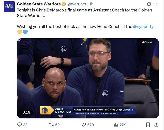 本场是克里斯德马科担任勇士助教的最后一场比赛,勇士官方送上祝福,根据此前Shams报道,纽约自由人已聘请其为主帅。