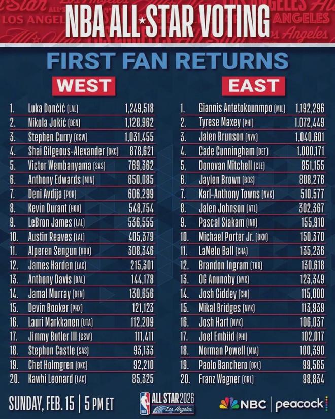 今天比赛不少,也有全明星相关的资讯,次条来一篇“大杂烩”吧! NBA官方公布全明星投票首轮结果。 东契奇124.9万票领跑全联盟,字母哥第二119.2万,库里西部第三,詹姆斯西部第九。 东部前五:字母哥、马克西、布伦森、坎宁安、米切尔 但是别忘了,今年全明星改制了,国际队VS美国队。