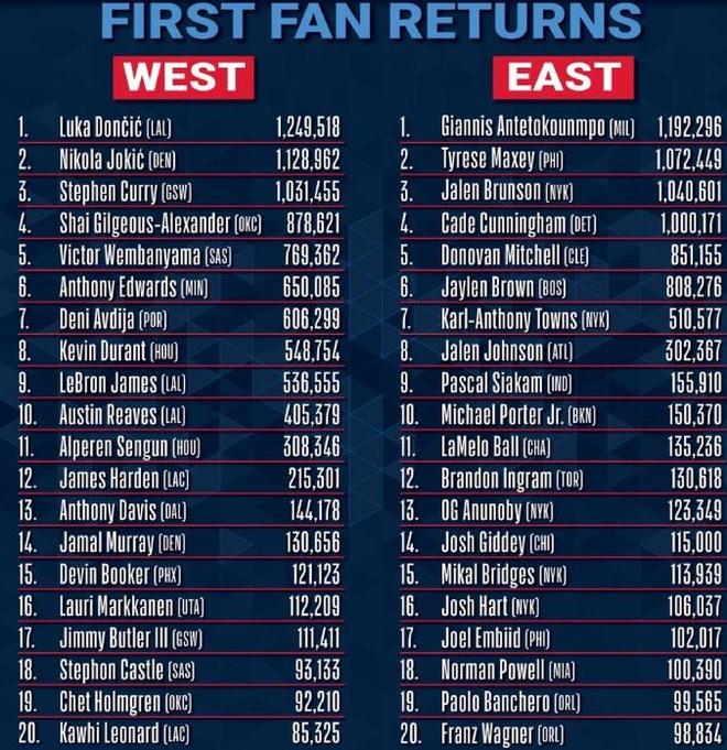 全明星首轮投票结果:詹姆斯仅排名西部第九,东契奇西部第一!