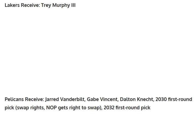 湖人:5换1墨菲三世 湖人得到:墨菲; 鹈鹕得到:范德比尔特+文森特+克内克特+2030年首轮+2032年首轮。