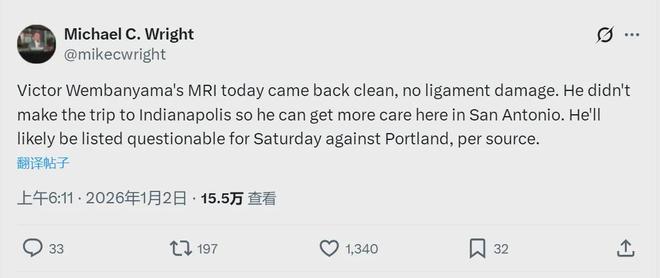 北京时间1月2日凌晨,据马刺随队记者Michael C. Wright报道,文班亚马没有随队前往印第安纳波利斯,而是留在圣安东尼奥接受进一步治疗,他确定缺席1月3日和步行者的比赛。MRI检查结果显示,文班亚马没有结构性的损伤。