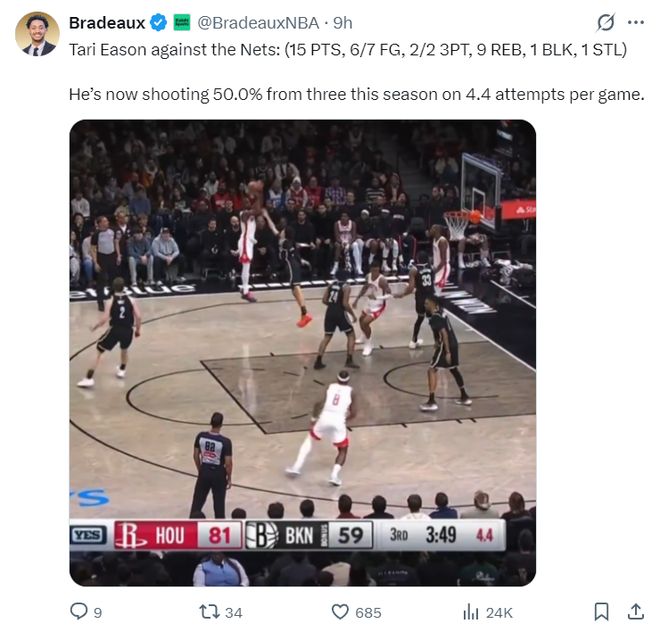 火箭记者Bradeaux写道:伊森本赛季三分命中率接近五成,场均要出手4.4次三分球。
