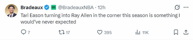 火箭记者Bradeaux继续写道:本赛季塔里-伊森的三分表现竟然跟雷阿伦如出一辙,这让我意想不到。