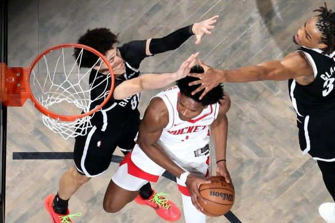 7年时间,篮网队只有2年称得上强队,但火箭队不管是摆烂时期,还是季后赛时期,又或者是重建期,7年间都没有在篮网主场赢过球。今天算是一个绝佳的机会了,因为篮网队本赛季的核心,场均能够得到25.8分的小波特缺阵,还有锋线上的曼恩,和新秀德明,可以说本赛季篮网队内表现出色的都休战了。虽然火箭队的两大内线亚当斯和卡佩拉也缺席比赛,但主力都是能够出战的状态。所以这场比赛,两队无论是硬实力还是状态都差了很多,所以这场比赛从一开始就没什么悬念。比赛一开始,火箭队的前6次出手全部命中,打出了一波12-2的进攻高潮,迫使篮网队在开局仅仅2分钟的情况下就喊出暂停。