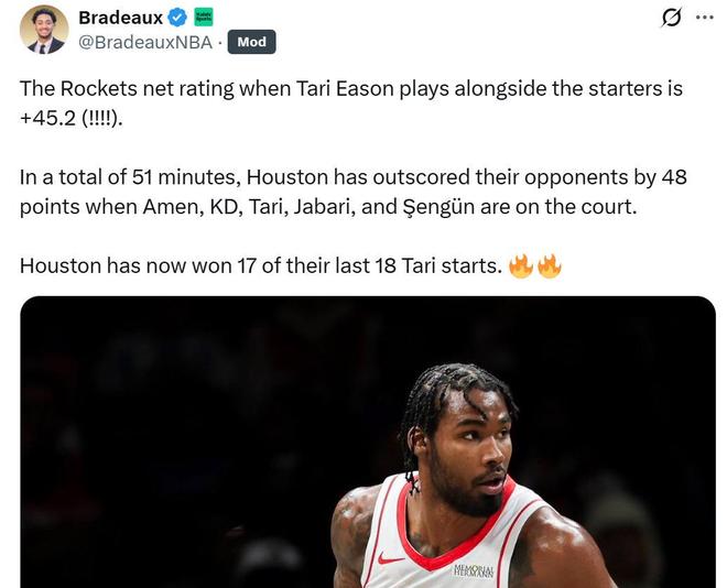 伊森首发时交出如此夸张的数据表现并非偶然,而是他的能力完美契合火箭队攻防体系,能够让身旁其余球员获得更好的发挥空间。