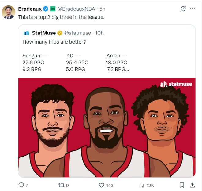 北京时间1月3日,数据媒体StatMuse晒出火箭三巨头的数据,申京场均22.6分钟9.3篮板6.7助攻1.5抢断1盖帽; 杜兰特场均25.5分4.5助攻5篮板0.8抢断0.9盖帽; 阿门场均18分7.3篮板5.3助攻1.3抢断0.5盖帽; 火箭记者Bradeaux转发后写道:这是联盟前二的三巨头组合。