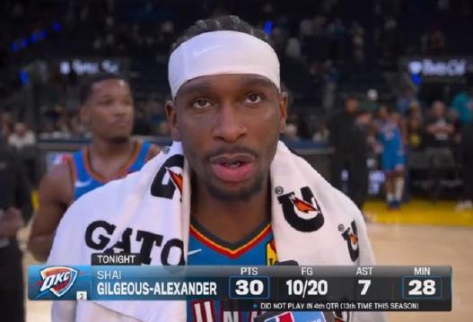 1月3日,雷霆131比94战胜勇士,本场比赛雷霆球员亚历山大全场20投10中,三分球5投3中,罚球7投7中,贡献30分1篮板7助攻!
