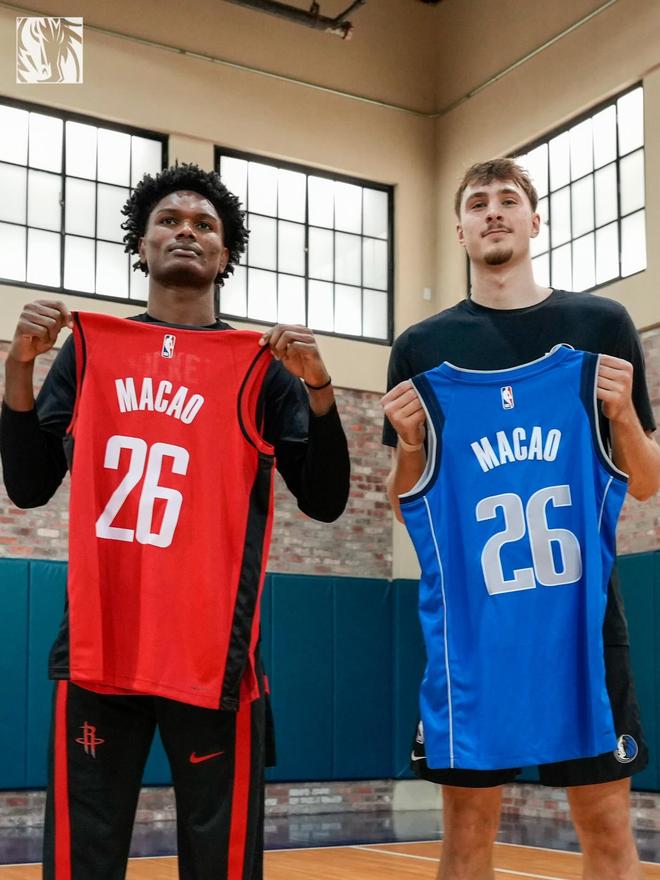 NBA官方分享火箭球员阿门-汤普森和独行侠球员弗拉格的照片庆祝中国赛,图片中,两人分别手持母队球衣,球衣上面印着26号MACAO(2026年澳门)。 NBA官方表示:NBA中国赛,我们来啦! |