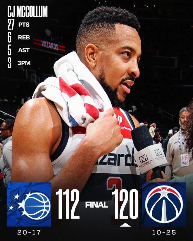 这场比赛,奇才球星、34岁的老将CJ麦科勒姆打出了相当不错的表现:全场出战38分钟,投篮19中11,三分7中3,罚球2中2,拿下27分6篮板5助攻,得分全场最高。