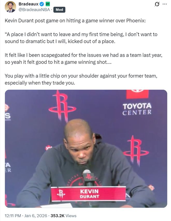 相信大家都看了杜兰特绝杀太阳赛后的采访,KD吐露了对前东家的不满,他很难受的说道:太阳原本是我最不愿离开的地方,我不想让外界听起来太夸张,但我还是会说我被他们踢出球队了。 去年太阳更衣室出了问题,团队将那些问题都归结于我,我成为了球队的替罪羊,所以当我投中制胜球后我感觉很不错,当我面对太阳时肯定是带有一点怨气打球,尤其是他们交易抛弃你时。