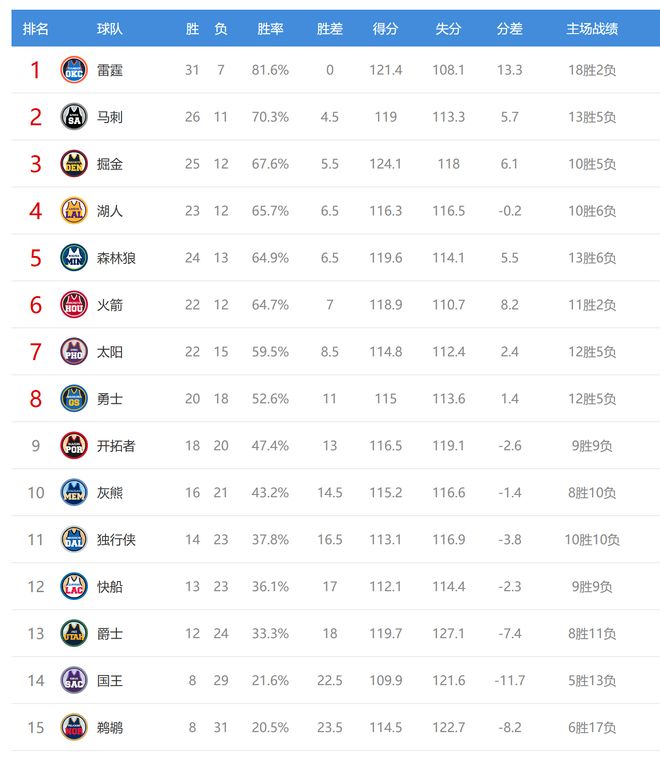北京时间2026年1月8日,今日NBA有12场比赛,湖人、勇士、火箭、快船、掘金、雷霆、马刺、开拓者、太阳、灰熊、爵士、鹈鹕参与其中,赛后西部排名发生了变化。 雷霆主场迎战爵士,雷霆缺少了哈滕、卡鲁索,爵士缺少了凯斯勒、乐福,雷霆上半场一度领先20分,但爵士在半场战罢时把分差追到5分,第三节双方旗鼓相当,三节战罢雷霆领先5分,第四节爵士打出得分潮,一度反超8分,比赛还剩3秒时仍领先2分,亚历山大压哨中投把比赛拖入加时赛,加时赛中雷霆更胜一筹,最终以4分优势击败爵士。亚历山大26中14得到46分6板6助,切特16中9得到23分12板3帽,杰伦15中6得到17分6板8助,爵士方面马尔卡宁19中11得到29分13板,乔治22中9得到25分7板11助,努基16中6得到15分15板4助3断。