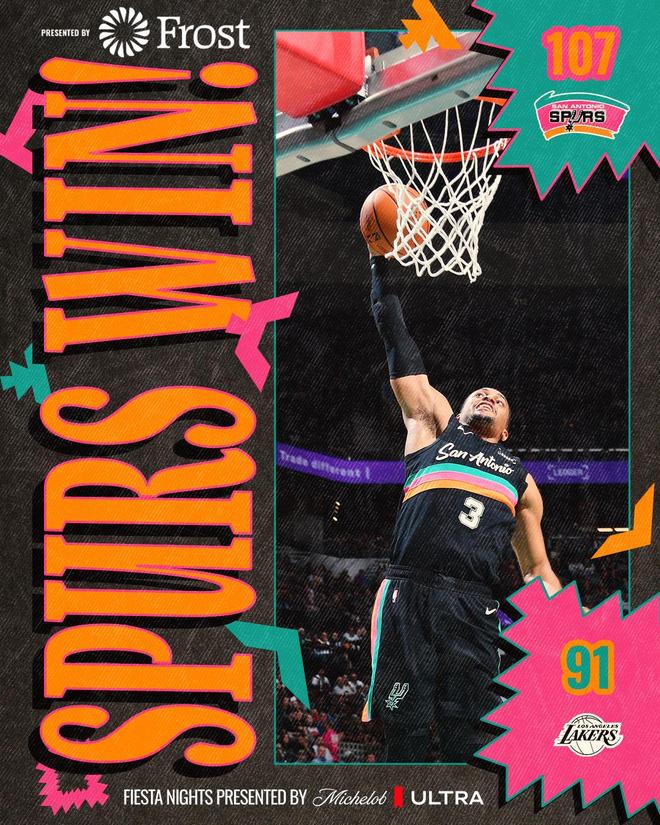 篮球直播站1月8日报道: NBA常规赛继续进行,洛杉矶湖人队(23胜12负)结束连胜。虽然东契奇送出38分三双,但约翰逊替补得到27分,文班亚马得到16分和14个篮板,他们率队下半场重新拉开领跑,圣安东尼奥马刺队(26胜11负)在主场以107-91战胜湖人队。马刺队结束2连败,湖人队的3连胜被终结。 马刺队的约翰逊得到27分和6个篮板,文班亚马得到16分和14个篮板,卡斯尔得到15分、5个篮板和4次助攻,福克斯得到14分和5个篮板,查帕涅得到11分和9个篮板。湖人队的东契奇得到三双38分、10个篮板和10次助攻,拉拉维亚得到16分和7个篮板,海耶斯得到10分和7个篮板,艾顿得到9分和6个篮板。