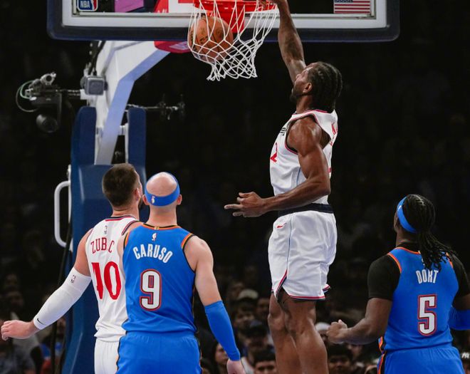 打勇士一战,只要祖巴茨给小卡挡拆,就直接带着对方防守人夹击小卡,至少有5次这种情况出现,这也是一场比赛巴特勒能抢断小卡4次的原因,因为祖巴茨没投射,对手根本不管他。打尼克斯一战,对手更直白:什么祖巴茨和邓恩,都不管了,直接夹击小卡!结果快船被一波流打花,失去悬念。快船6连胜期间,泰伦卢被迫换上大洛打首发,已经是走大运摸到正确答案了,但凡伦纳德身边有1-2个能投三分球的空间点,他都能轻松冲击篮下。上赛季因为有鲍威尔,所以小卡也不用承担那么大的得分压力。