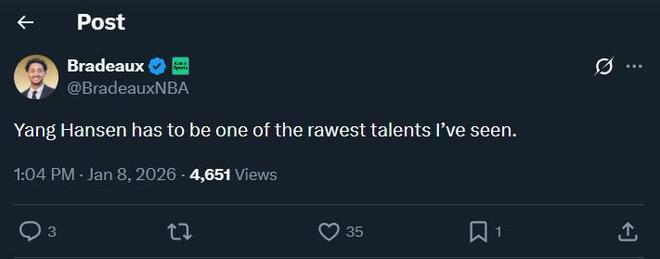 比赛期间,火箭队跟队记者Bradeaux发文称赞了杨瀚森的表现,他写道:“杨瀚森绝对是我见过最有天赋的球员之一。” 全场比赛,杨瀚森16分31秒的时间内4投1中得到了3分3篮板2助攻,出现了2次失误和5次犯规,正负值为+2。