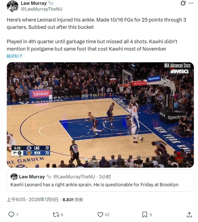 这次受伤的过程充满了偶然与无奈。对阵尼克斯的第三节,伦纳德在一次底线跳投命中后,回防时不慎踩到了场边一位球迷的脚,导致右脚踝再次扭伤。在他受伤退场前,仅仅两节半的时间,他就已16投10中高效砍下25分,状态火热。尽管第四节他试图带伤坚持,但明显受到影响,4次出手全部偏出。这次意外的踩踏,不仅中断了他个人的得分表演,更可能直接扭转快船刚刚好转的赛季轨迹。