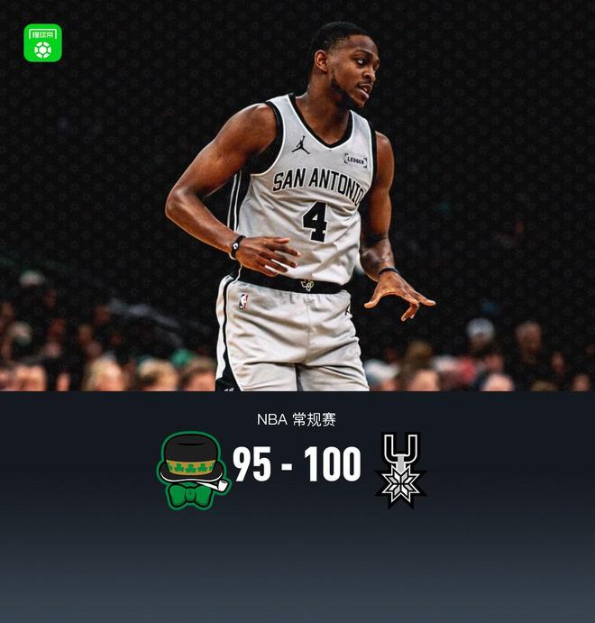 第一节凯尔特人杰伦-布朗拿下12分,马刺凯尔登-约翰逊拿下6分,首节战罢凯尔特人26-21领先马刺 第二节凯尔特人德里克-怀特拿下15分,马刺尚帕尼拿下7分,半场结束凯尔特人55-50领先马刺 第三节凯尔特人杰伦-布朗拿下8分,马刺文班亚马拿下9分,第三节结束凯尔特人75-73领先马刺 第四节凯尔特人德里克-怀特拿下9分,马刺凯尔登-约翰逊拿下7分,最终凯尔特人95-100不敌马刺