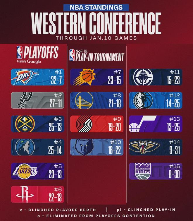 最后来看看各队最新排名,快船距离西部第六还差8.5个胜场。等到常规赛结束时,你觉得快船能冲进西部前六吗?
