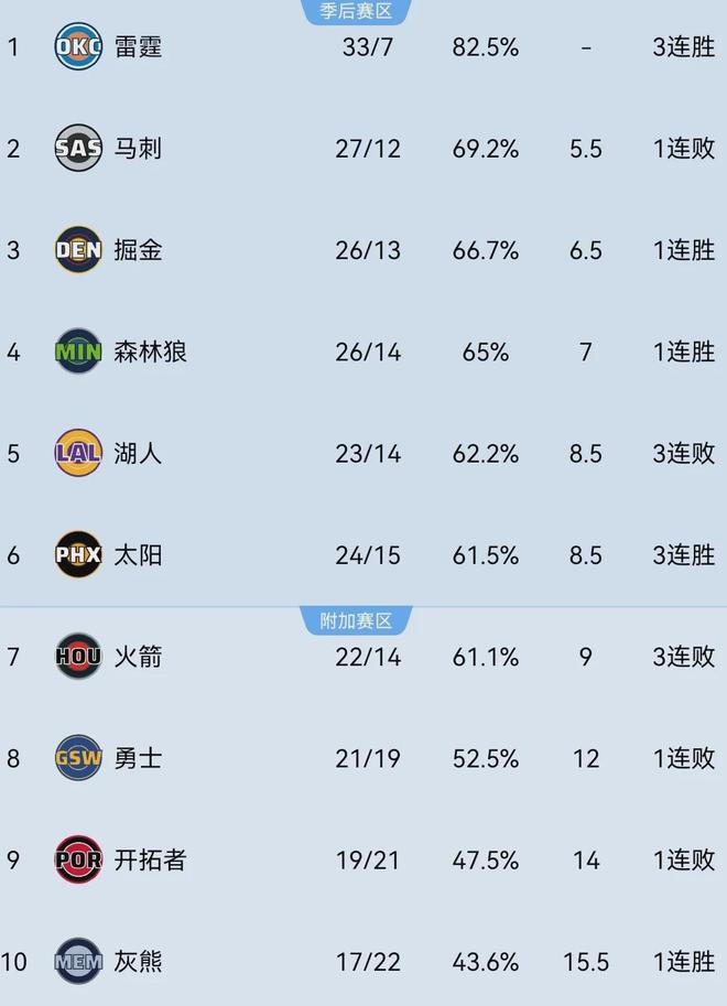 太阳24胜15负西部第六升至季后赛区域,火箭22胜14负掉入附加赛区域。
