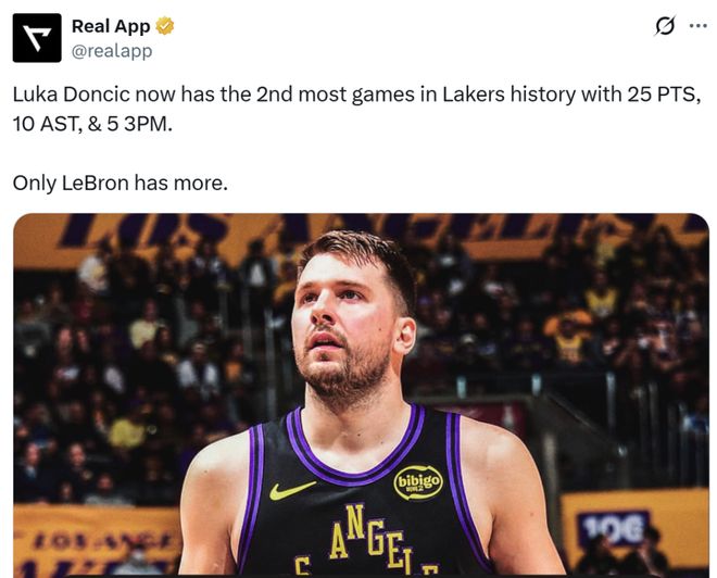 第二大利好:东契奇主动调整 另外一名核心东契奇则在带伤作战的情况下持续暴走,全场16投7中,三分9中5,拿下27分5板12助1帽,正负值+27。 这是东契奇湖人生涯第3次单场拿下至少25+10助+5三分,已经升至队史第二名,仅次于詹姆斯的6次。