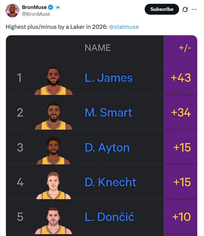 在背靠背出战的情况下,交出这样的表现,也是詹姆斯41岁依旧保持高效输出的缩影。 41岁后詹姆斯场均仍能交出27.7分7.7板7.8助攻全能数据,并且投篮命中率55%。 更重要的是,詹姆斯在拿下漂亮数据的同时并没有伤害球队,26年以来詹姆斯以+43的累计正负值高居全队第一,斯马特+34排在第二。