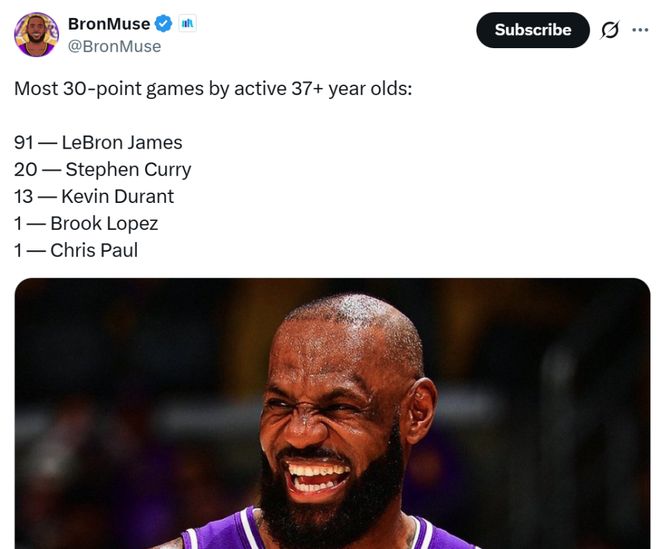 第一大利好:41岁老詹准三双 本场在背靠背作战的情况下,41岁詹姆斯用行动证明自己还能统治赛场,全场20中12高效拿下31分9板10助1断1帽准三双全能数据,正负值+17。 凭借这样的表现,詹姆斯41岁后出战7场比赛,就成功占据NBA历史41岁后得分榜前7中的6席,也再度刷新由自己保持的NBA历史最老单场30+纪录。 同时本场是詹姆斯37岁后第91次单场拿下30+得分表现,继续断档占据NBA历史第一,库里以20次排在第二。