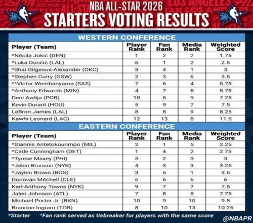 西部球迷投票前十结果: 1、卢卡·东契奇(洛杉矶湖人):3402967票 2、尼古拉·约基奇(丹佛掘金):2992895票 3、斯蒂芬·库里(金州勇士):2817562票 4、谢伊·吉尔杰斯-亚历山大(俄克拉荷马雷霆):2345743票 5、德尼·阿夫迪亚(波特兰开拓者):2202605票 6、维克托·文班亚马(圣安东尼奥马刺):1965462票 7、安东尼·爱德华兹(明尼苏达森林狼):1960957票 8、勒布朗·詹姆斯(洛杉矶湖人):1819776票 9、凯文·杜兰特(休斯顿火箭):1554668票 10、阿尔佩伦·申京(休斯顿火箭):1430020票 东部球迷投票前十结果: 1、扬尼斯·阿德托昆博(密尔沃基雄鹿):3218398票 2、泰里斯·马克西(费城76人):2941622票 3、杰伦·布伦森(纽约尼克斯):2858615票 4、凯德·坎宁安(底特律活塞):2681392票 5、杰伦·布朗(波士顿凯尔特人):2477073票 6、多诺万·米切尔(克利夫兰骑士):2316014票 7、卡尔·安东尼-唐斯(纽约尼克斯):1287354票 8、杰伦·约翰逊(亚特兰大老鹰):794898票 9、小迈克尔·波特(布鲁克林篮网):536683票 10、布兰登·英格拉姆(多伦多猛龙):512837票