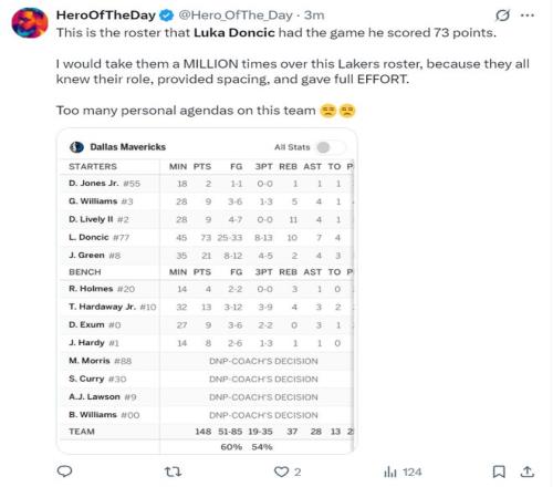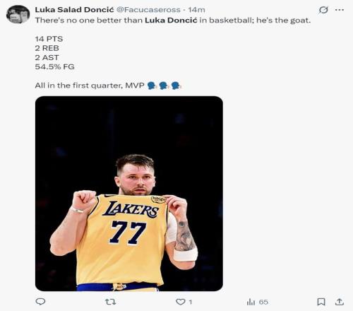 东契奇再度拿到30+5+5的数据已经是湖人队史第三多,赛后斯利普-贝勒斯吐槽东契奇:最后拒绝投空位三分是因为他知道自己三分太差,但为什么没人提及这一点? |