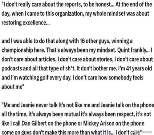 詹姆斯还进一步强调:“坦率地讲,媒体的报道、播客里的言论,我都不怎么看我,我也不在乎。要是你了解清楚我究竟是怎样的人。” 当被问到近期是否与珍妮·巴斯有过交流时,詹姆斯的回答十分干脆:“我们之间几乎没什么交流。我不明白,其实我和珍妮之前也很少打电话沟通,你们应该也没见过相关的报道吧。我不会把这种事小题大做,我们彼此尊重,双方一直保持着良好的合作关系。但我也不会特意给她,就像我从未给热火队老板米奇·阿里森或者骑士队老板吉尔伯特打过电话一样。得了吧,各位,别把这事儿无限放大了,我真的不在乎。”