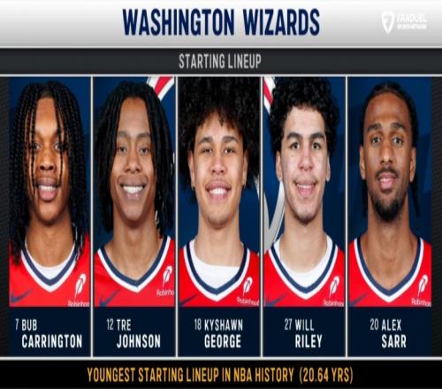 奇才队今日派出了NBA历史最年轻的首发阵容:平均20.64岁