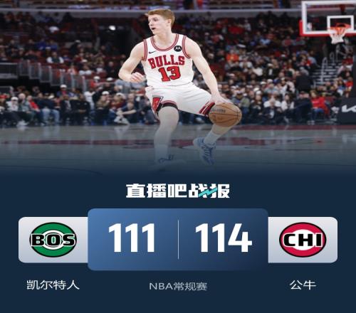 ![]() 体育播报1月25日宣 NBA常规赛,凯尔特人对阵公牛,两队最近状态都还不错,凯尔特人取得2连胜,公牛取得3连胜。 开场后两队就在外线连续对飙三分,公牛外线手感更加火热不断命中三分逐渐建立领先,杰伦·布朗多次冲击内线为凯尔特人追上比分。第二节上来两队又陷入僵持,场上比分多次打平,杰伦·布朗重新登场后带领凯尔特人打出一波攻势取得领先,半场过后凯尔特人领先6分。易边再战,公牛上来连得7分直接打停凯尔特人,暂停过后凯尔特人两记三分止血,但凯尔特人的攻势没有能够延续,再度被公牛反超比分。末节决战两队依旧是拉锯战,虽然凯尔特人一度反超比分,但公牛迅速回应,杰伦·布朗在比赛最后关头一条龙帮凯尔特人追平比分,许尔特三分绝杀,最终公牛114-111险胜凯尔特人。