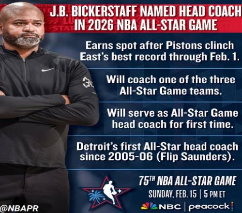 活塞官宣:比克斯塔夫当选全明星主帅06年桑德斯后队史首人