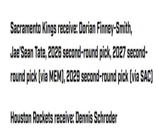 5换1方案如下 国王得到:芬尼史密斯+泰特+26年火箭二轮+27年灰熊二轮+29年国王二轮; 火箭得到:施罗德。