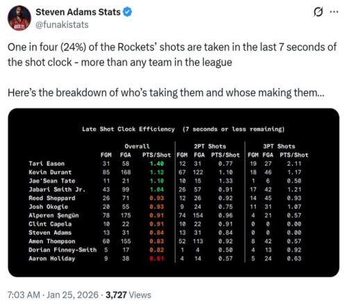 火箭一项数据倒数第一 根据火箭媒体Steven Adams Stats统计,开赛至今火箭队在24秒进攻前17秒出手的占比仅为76%联盟倒数第一,后7秒占比高达24%联盟第一。