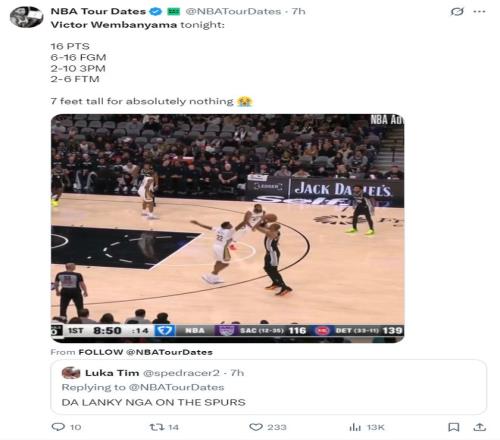 这场比赛马刺惨败的罪人就是核心维克托-文班亚马,他作为一名身高7尺4寸(裸足达到2.24米)的内线,他在面对奎因、玛特科维奇、锡安时打不到内线,他更是被胖虎各种顶着上篮,文班亚马的身体对抗差到极致。 全场比赛16次出手有10次来自于三分线外,他是一点都打不进去,正如杜兰特所说这样高的身高就该去篮下要球打,你一直飘在外线队友怎么打?31分钟,16中6+三分10中2,命中率37.5%,三分命中率20%,拿到16分16篮板4盖帽3失误。