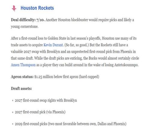 在8换1引进杜兰特后,火箭队依旧手握海量筹码,完全有能力追求字母哥。