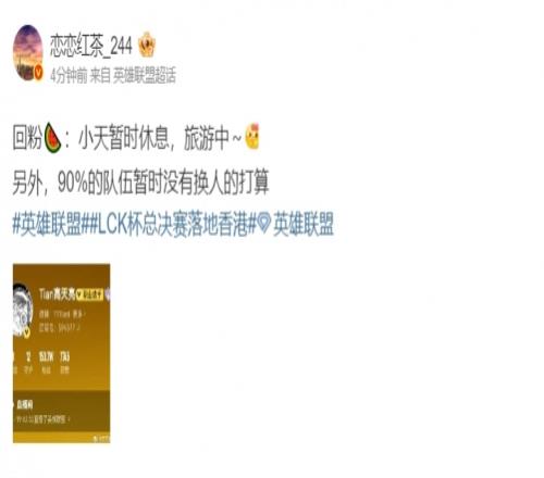 今日微博爆料人“恋恋红茶”更博爆料表示:Tian近期不直播是因为去旅游,而非前往某个队伍试训。 另外,90%的队伍暂时没有换人的打算。