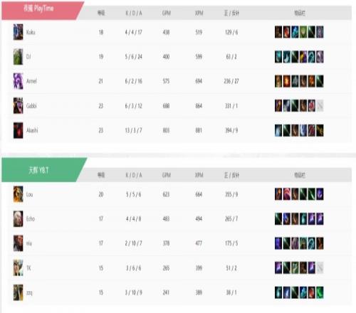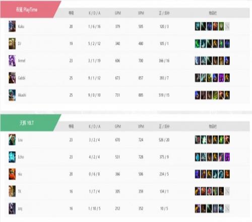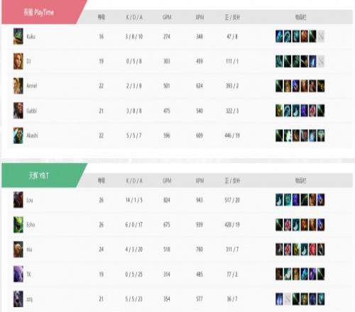 天辉YB.TT:Echo毒龙、TK虚空假面、niu半人马、Lou拍拍熊、zzq巫医 夜魇Playtime:Armel光法、kuku朗戈、Akashi琼英碧灵、Gabbi斧王、DJ风行者 赛后数据: