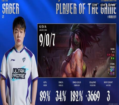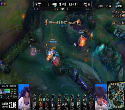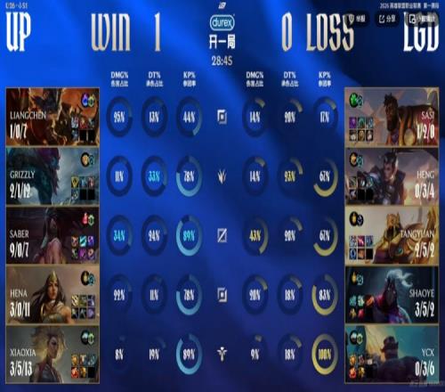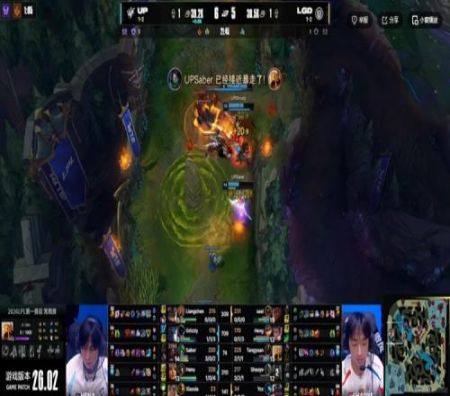 首发名单: UP:上单Liangchen、打野Grizzly、中单Saber、下路Hena、辅助xiaoxia LNG:上单Sasi、打野Heng、中单Tangyuan、下路Shaoye、辅助Ycx 战局回顾: 3分钟河道大战Shaoye维鲁斯用命打满输出拿下一血!LGD打出1换2!前期双方总体节奏偏慢,15分钟先锋团Saber阿卡丽单杀掉Tangyuan沙皇,UP拿下峡谷先锋!21分钟UP中路强开击杀LGD下路组,上路单带塔的Tangyuan沙皇随后也被UP三人围杀!这波打完UP拿下近2K的经济优势!