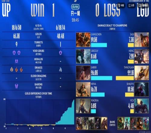 28分钟LGD上路强动Liangchen兰博,但是被UP迅速支援反打,xiaoxia芮尔完美开团帮助Saber阿卡丽再砍三杀!UP轻松团灭LGD,从中路一波结束掉首局的比赛!