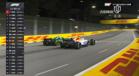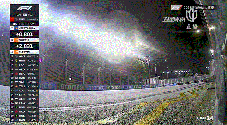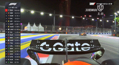 第46圈,领头的拉塞尔已经套圈并进入到了慢车堆中,身后维斯塔潘也追上慢车降速,这让身后的诺里斯进入到了自己的DRS区!