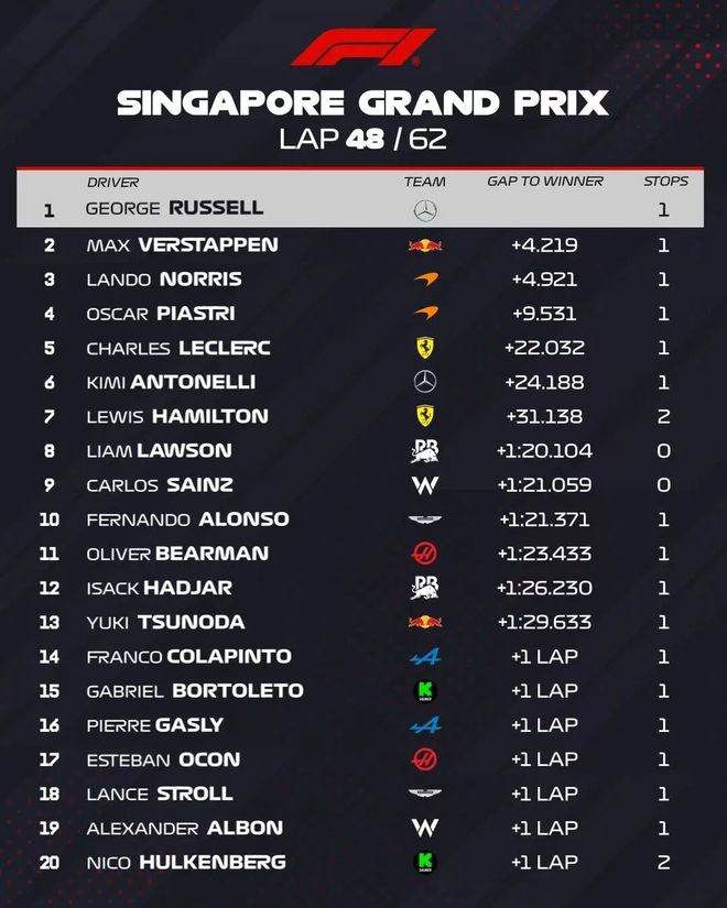 北京时间10月5日晚,2025赛季F1结束了新加坡站的正赛争夺。最终,拉塞尔第一个冲过终点实现Pole To Win!同时,这也是新加坡站近6年来的第6位冠军!维斯塔潘强势守住第二获得亚军。
